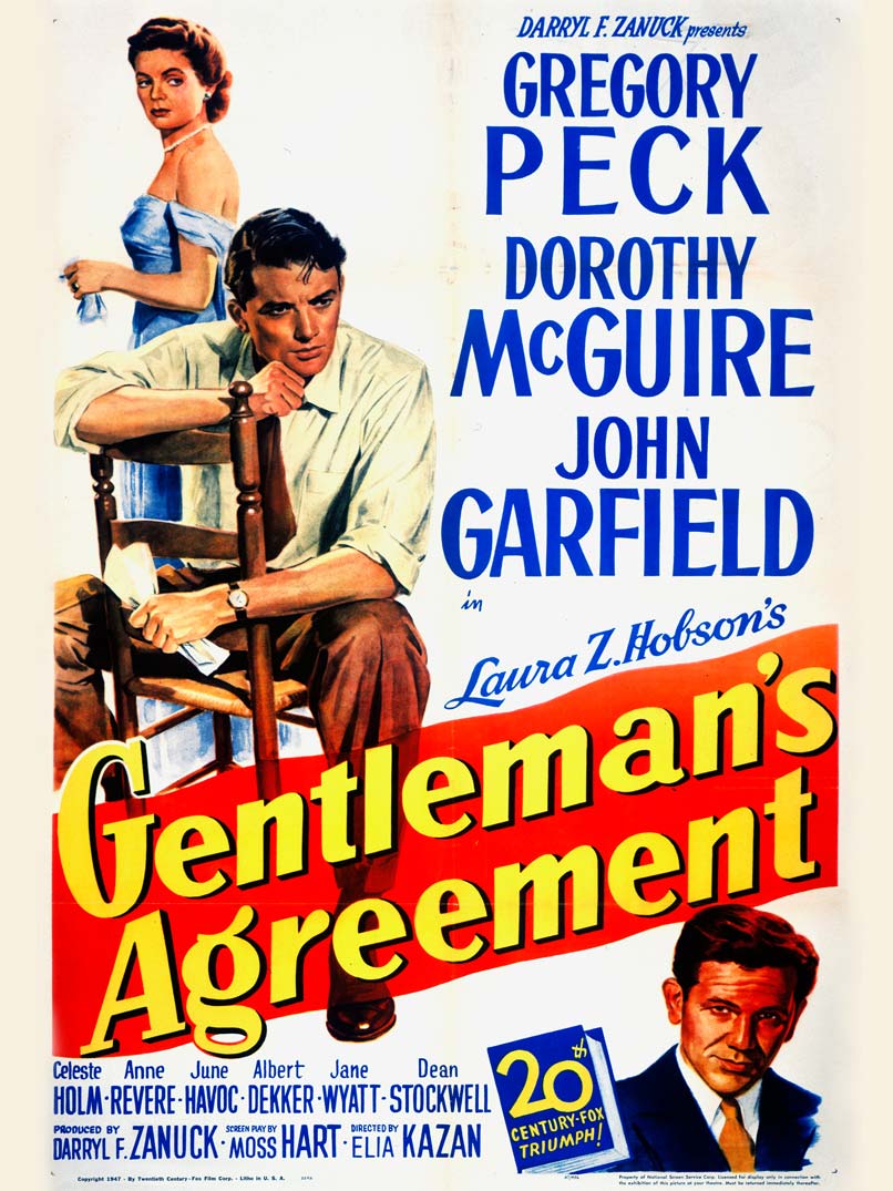 "Gentleman's Agreement" (1947) is the story of a journalist who adopts a Jewish identity to expose anti-Semitism in post-World War II America. The film, which was both a critical and financial success, earned eight Academy Award nominations and won three Oscars, including Best Director for Elia Kazan and Best Picture.