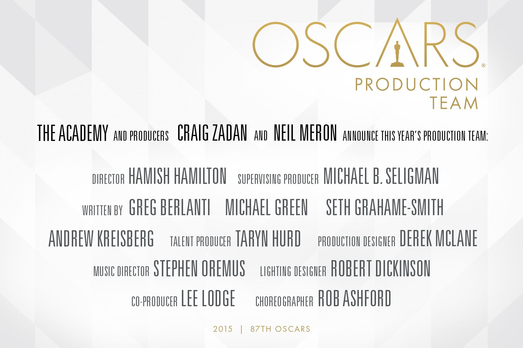Producers Craig Zadan and Neil Meron today announced 13 key members of the production team for the 87th Academy Awards®, which will air live on Oscar® Sunday, February 22, 2015, on ABC.