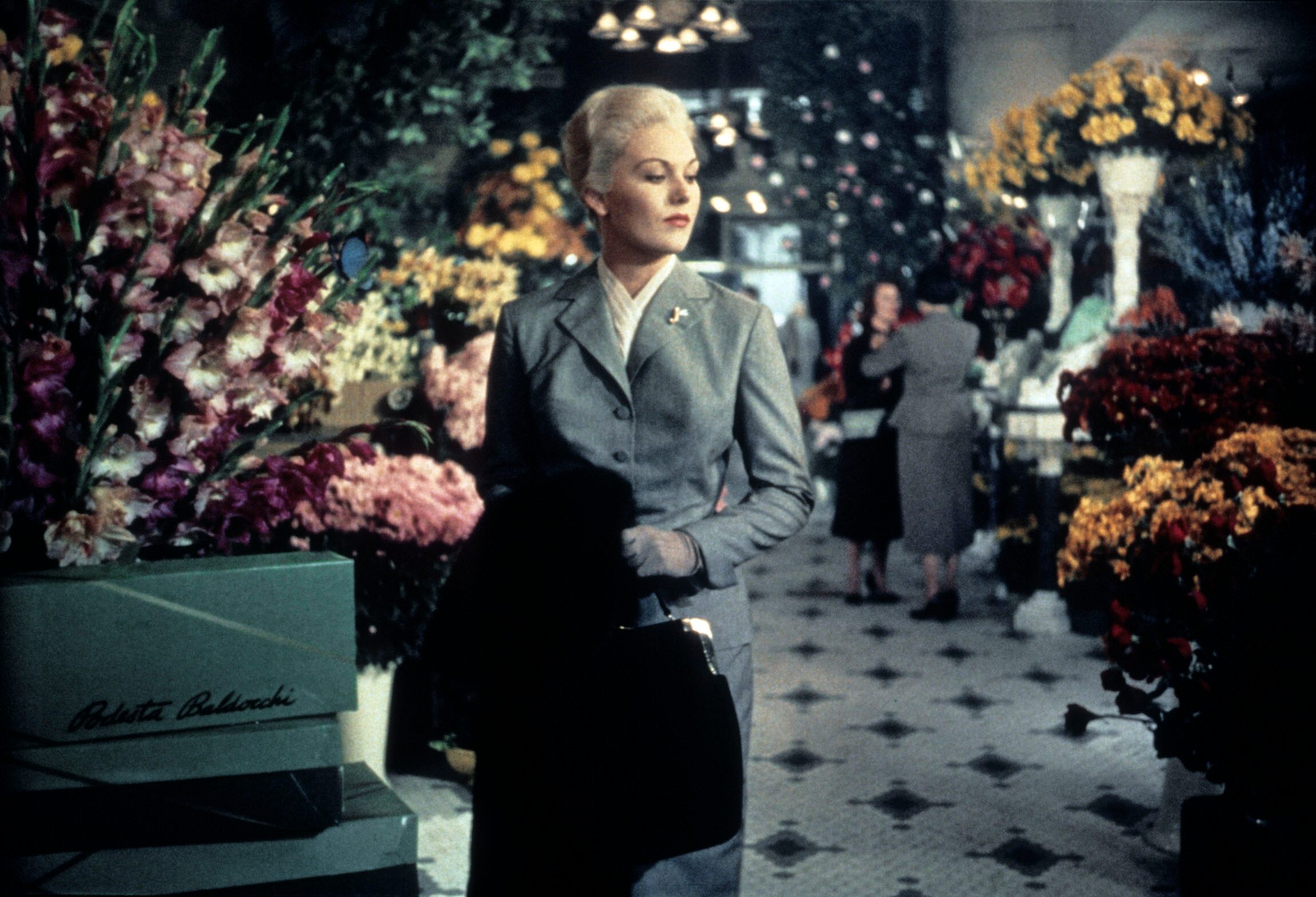 This demure gray suit is first seen on Madeleine as she enters a flower shop, a stiff, drab figure in a riot of color. The same costume reappears midway through the film when Jimmy Stewart’s character uses it to transform Judy back into Madeline.