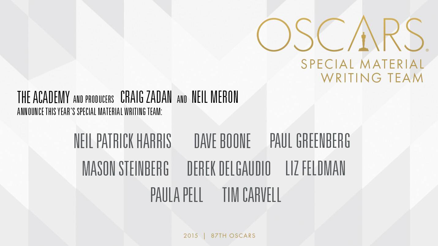 Producers Craig Zadan and Neil Meron today announced the special material writing team for the 87th Oscars, which will air live on Oscar Sunday, February 22, 2015, on ABC.