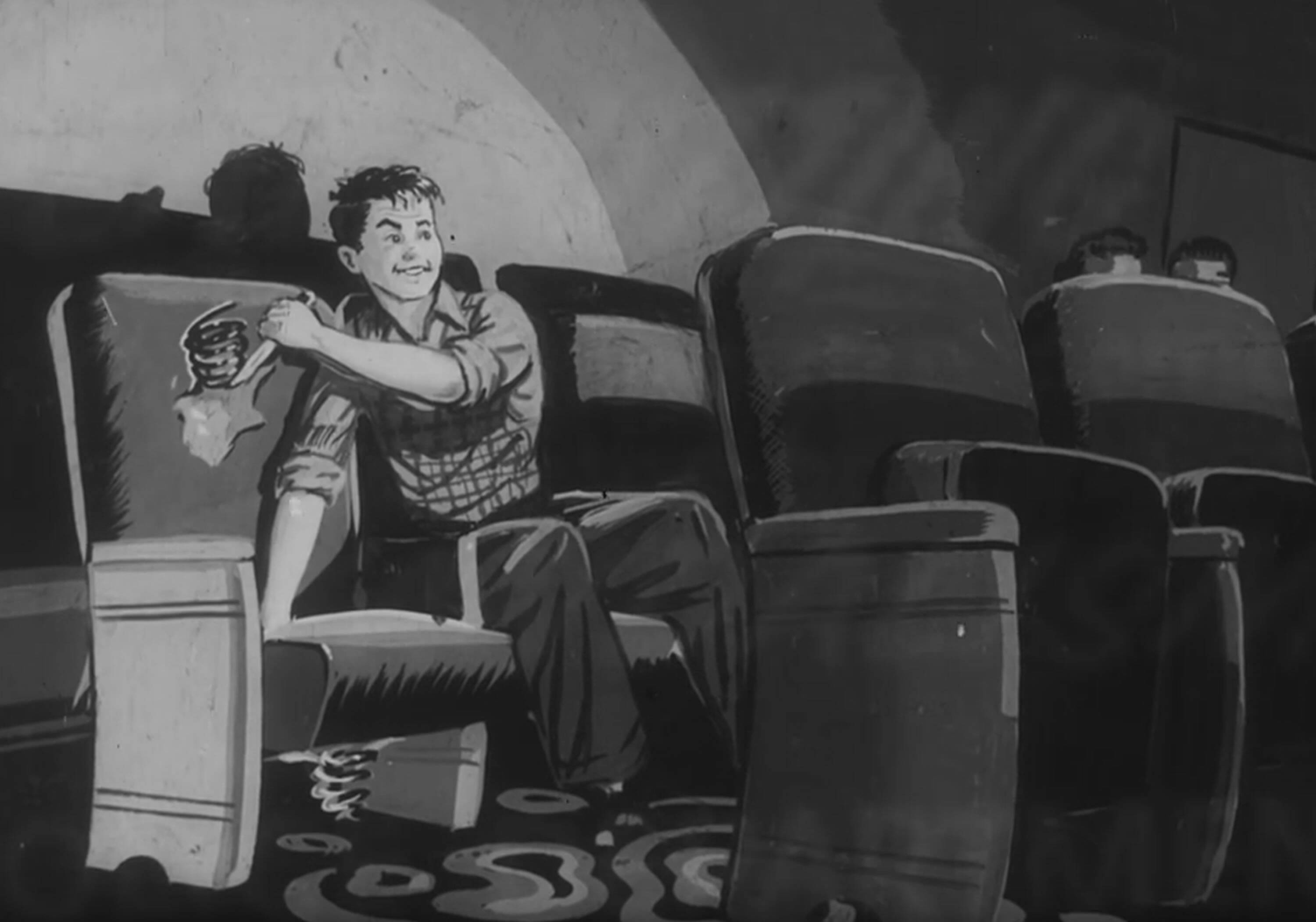 Among the thousands of theater advertisements held at the Academy Film Archive, this brief advertisement, made circa the 1950s, points to a relatively unknown phenomenon at the time: seat cutting. This short policy trailer, or snipe, cautions moviegoers of the strict consequences of upholstery defacement.