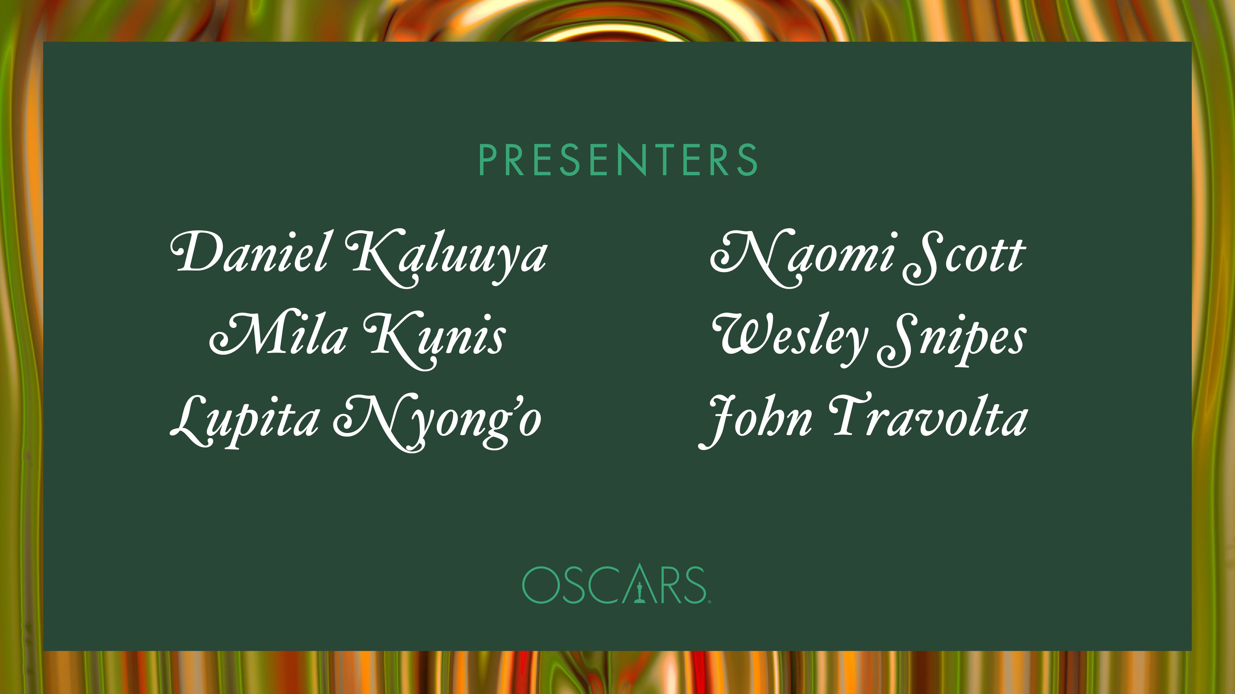 Show producers Will Packer and Shayla Cowan today announced the next wave of star presenters headed to the stage for the 94th Oscars®. The lineup includes Daniel Kaluuya, Mila Kunis, Lupita Nyong’o, Naomi Scott, Wesley Snipes and John Travolta. The Oscars will air live on ABC and broadcast outlets worldwide on Sunday, March 27, 2022, at 8 p.m. EDT/5 p.m. PDT.